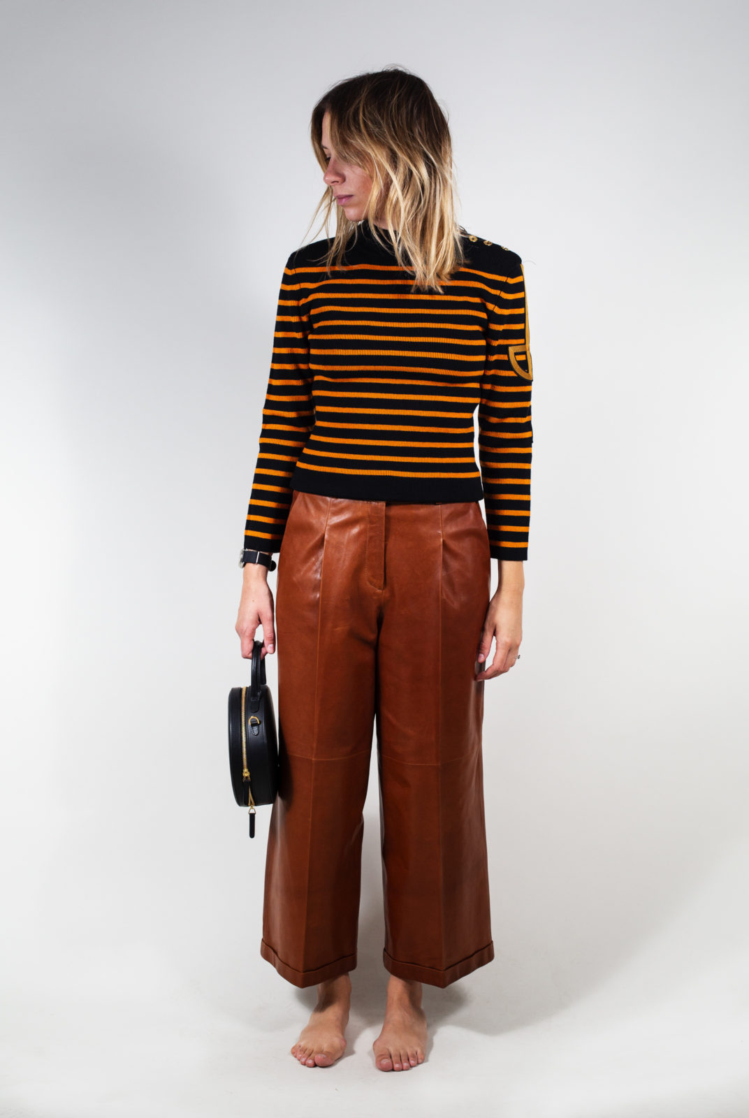 Leather expert Arma offers crop cut pants and suede leather skirts. Strong and timeless pieces of your wardrobe to mix with knitwear.