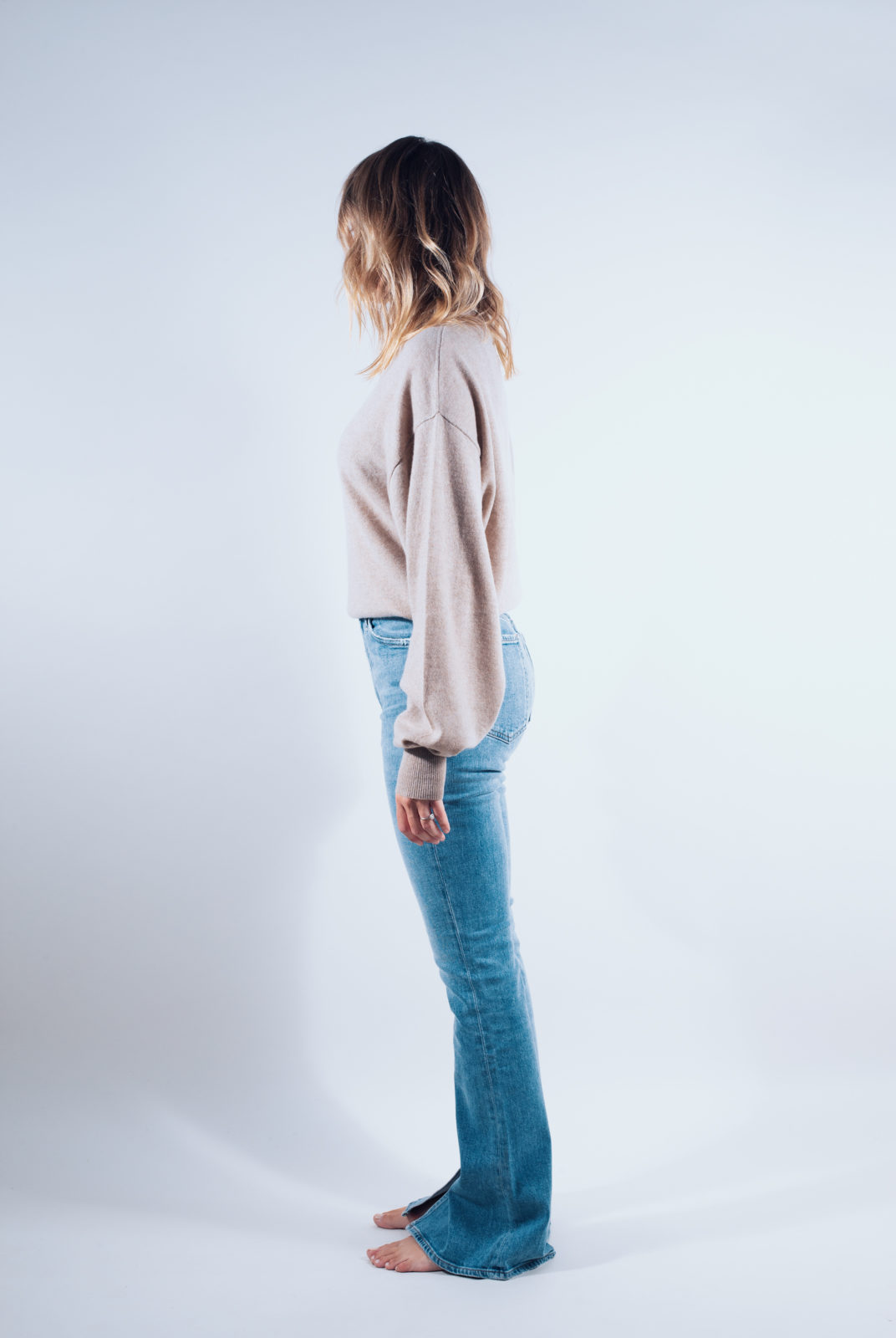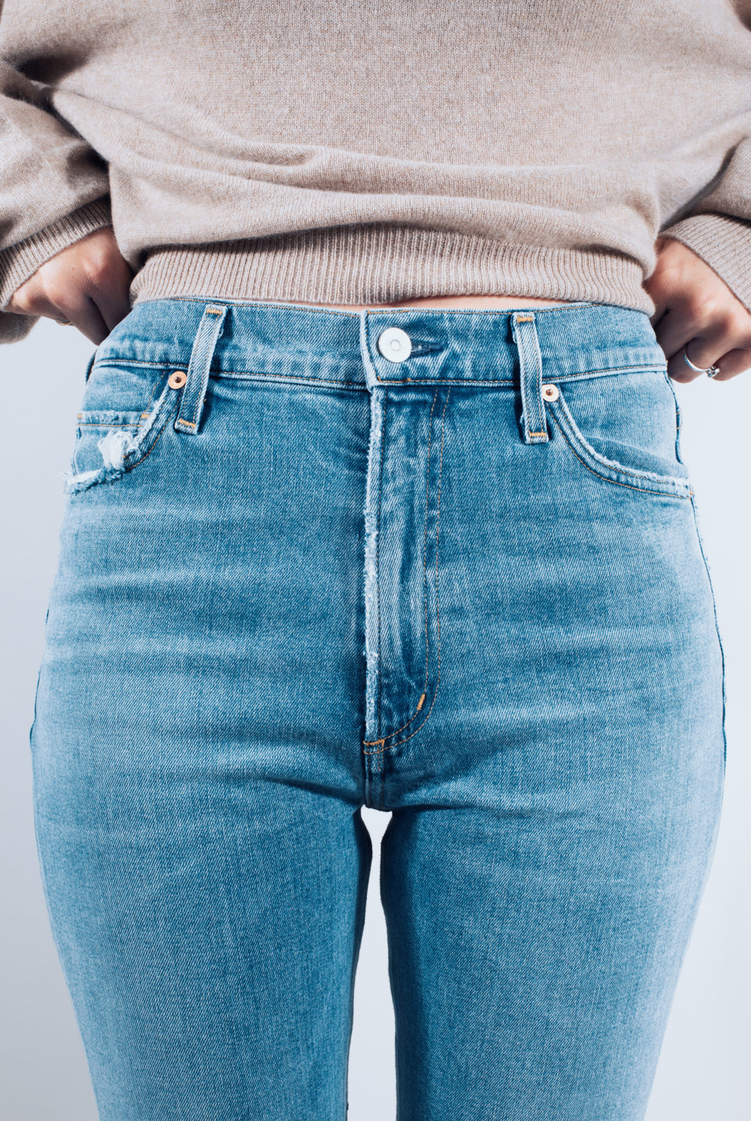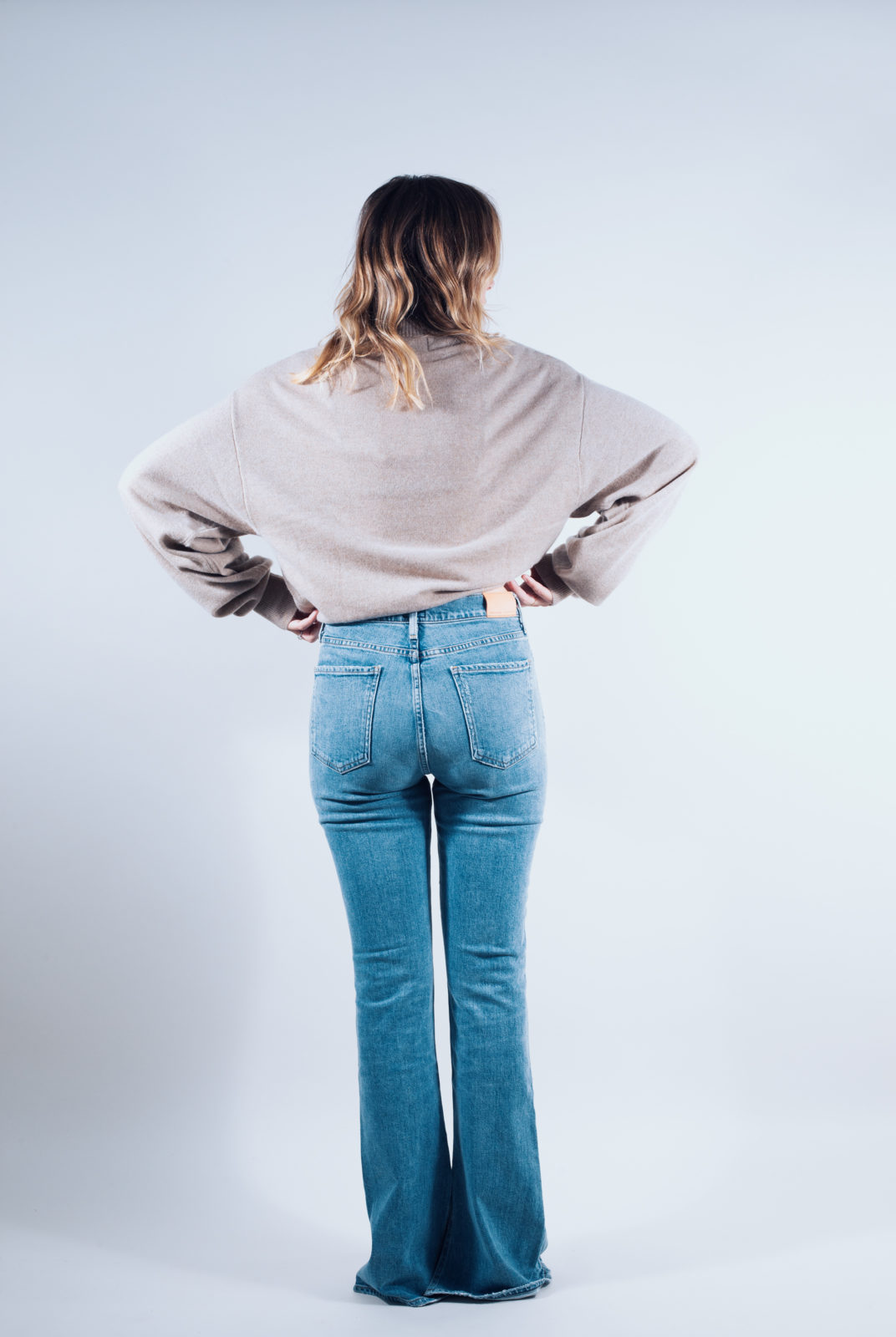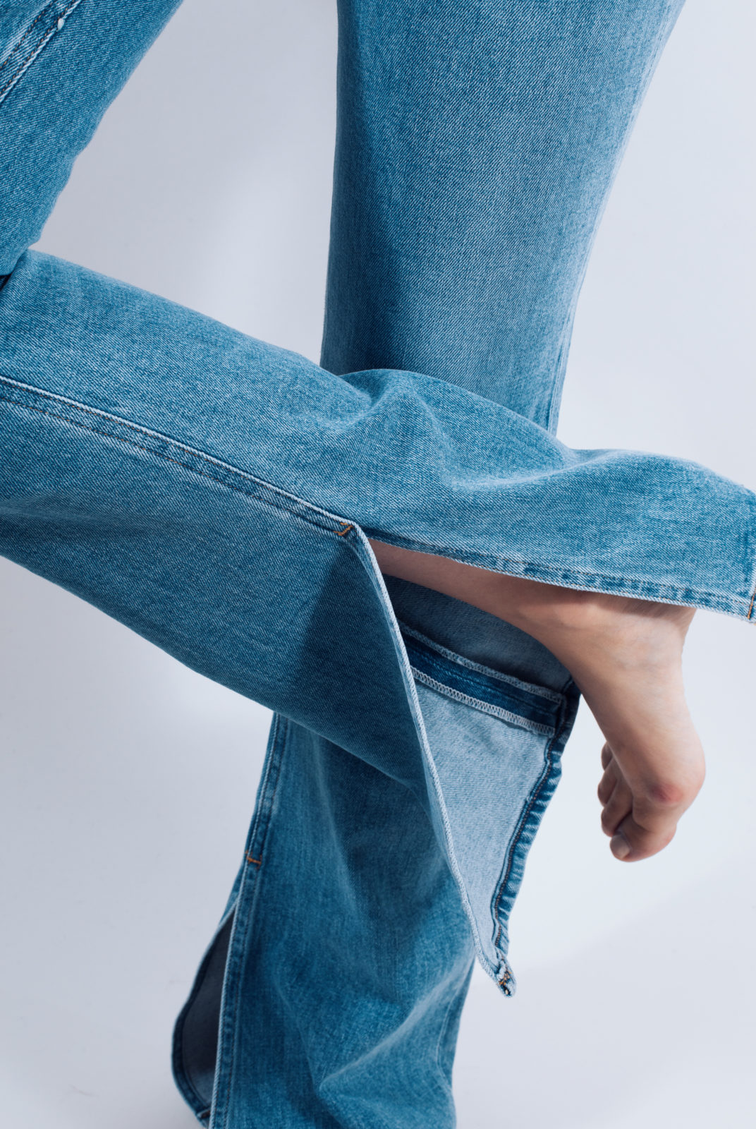 Semi-flared leg, slightly flared below the knee, features slit on the inner leg, comfort stretch