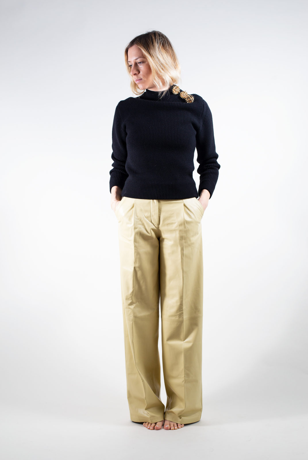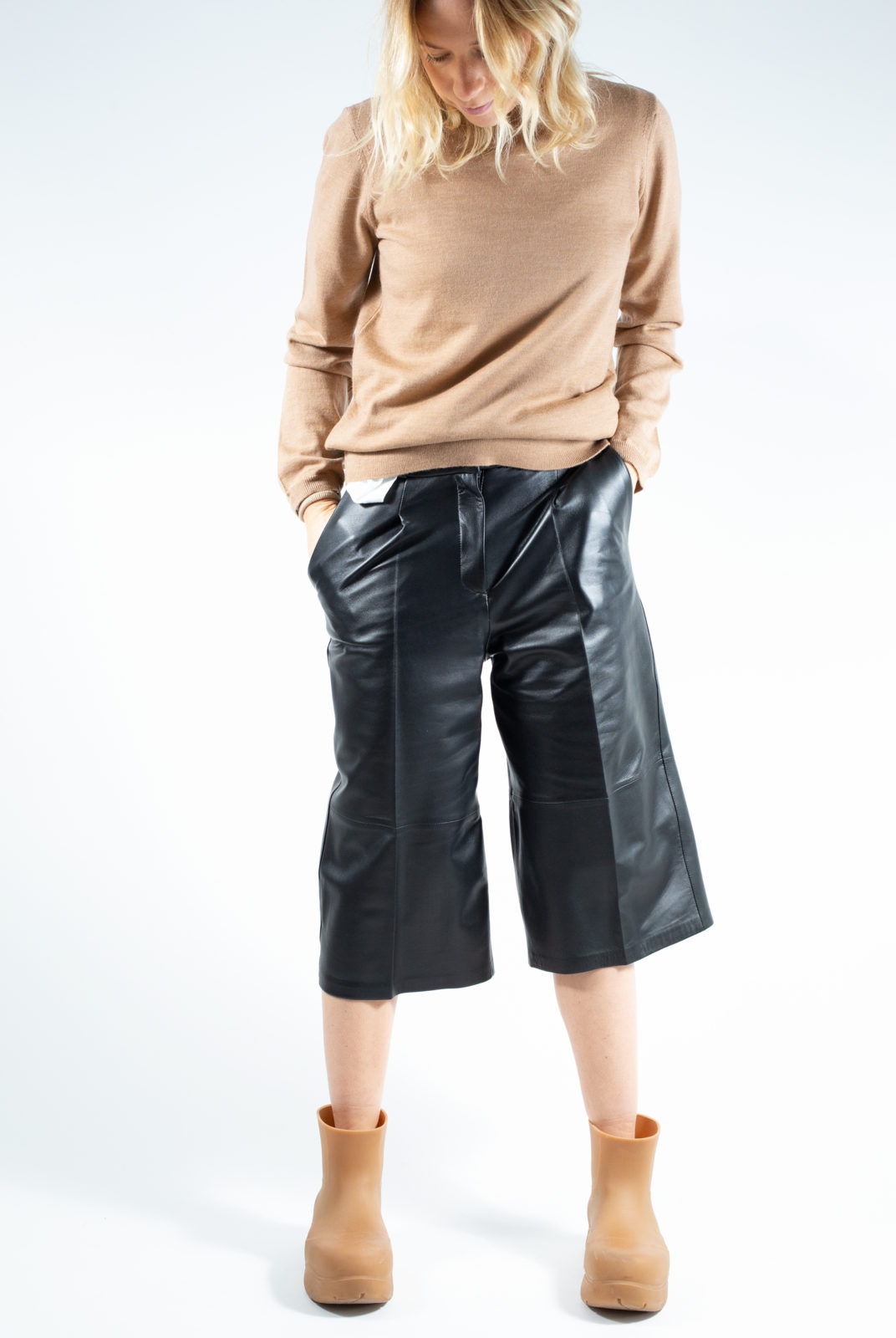 Expert du cuir, Arma propose des pantalons à coupe crop et jupes en cuir suede. Des pièces fortes et intemporelles de garde robe à mixer avec des mailles.