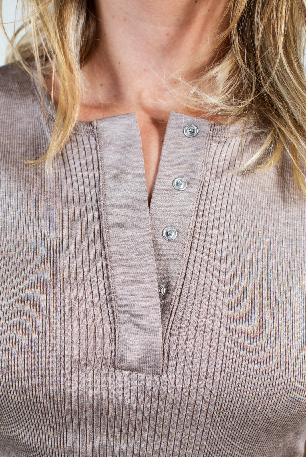 Col ras-du-cou, empiècement côtelé au centre, décolleté et fermeture munis de boutons-pression