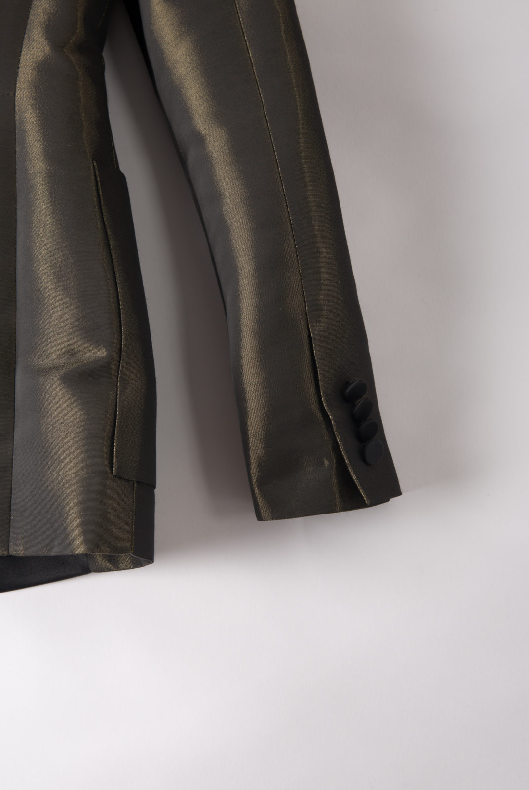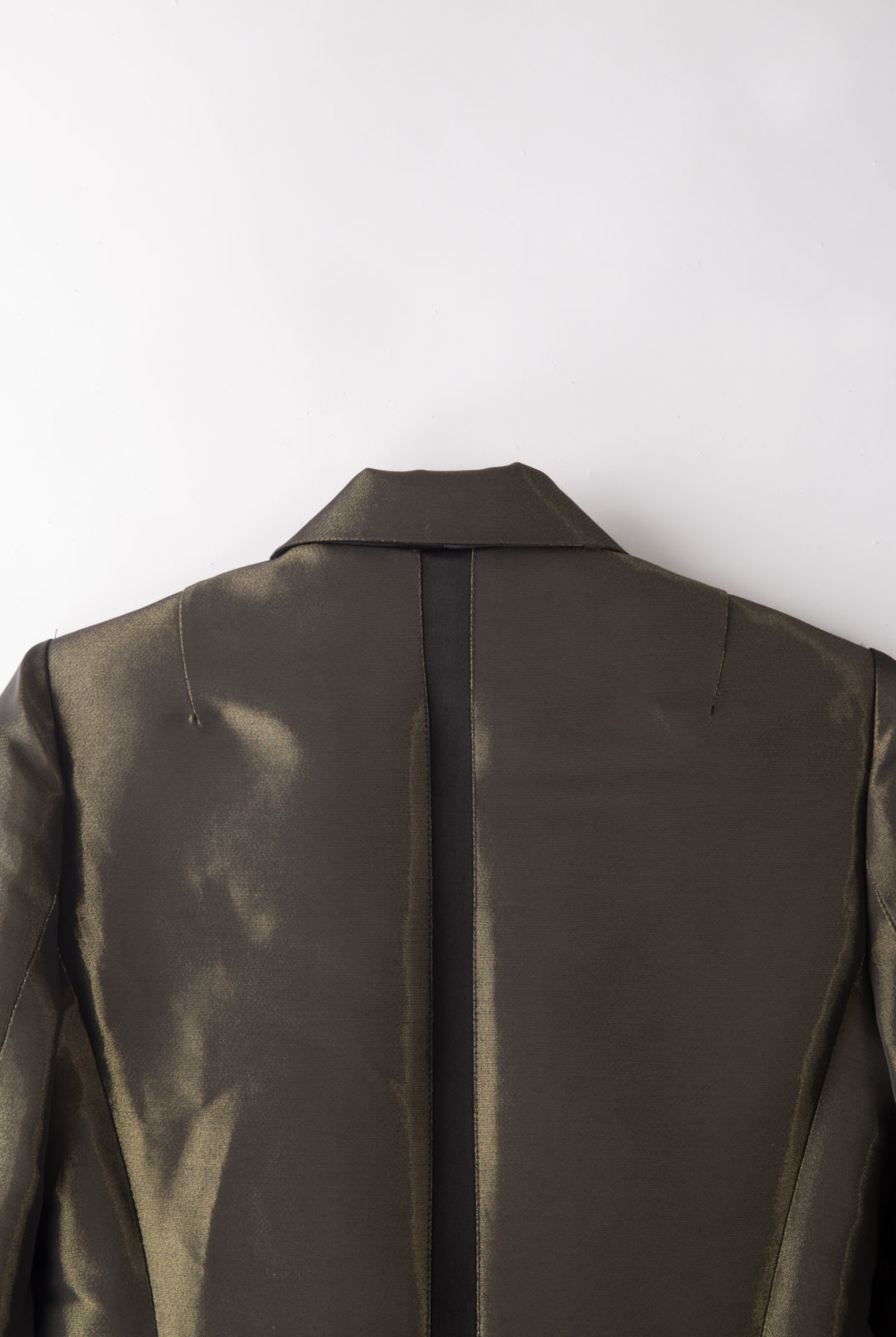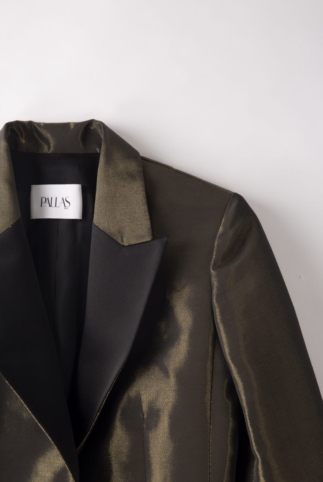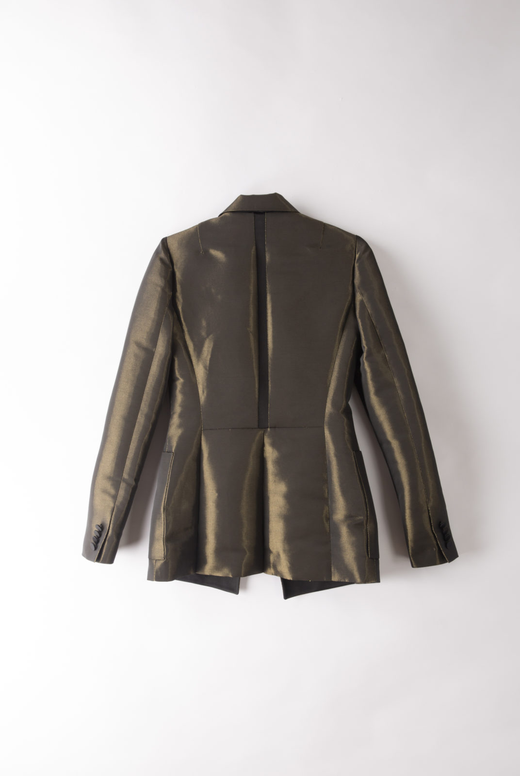 Effet irisé doré, retour col en satin noir, détail dos bandeau noir, grandes poches de chaque coté